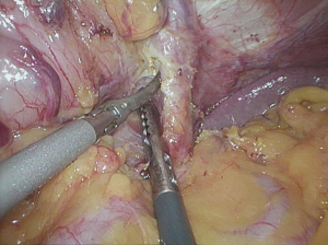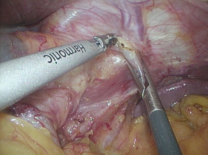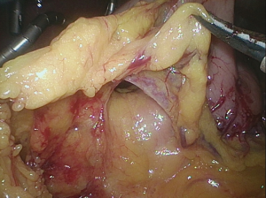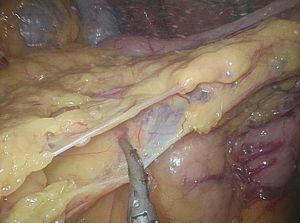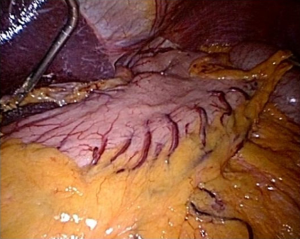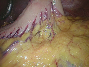 The gastrocolic ligament is then divided. This is facilitated by the operating surgeon gently grasping the anterior wall of the stomach with the left hand and elevating the stomach toward the hiatus while the assistant applies downward traction on the gastrocolic ligament near the edge of the transverse colon. This puts the gastrocolic ligament on some tension and helps to expose the right gastroepiploic arcade (Figure 3). Once the right gastroepiploic vessels have been identified, the division of the gastrocolic ligament is initiated usually at a point near the mid antrum. Dissection initially proceeds in a cephalad direction up the greater curvature to the level of the left gastroepiploic which is divided with the energy device (Figure 4). In overweight individuals, this part of the dissection can be challenging because of the amount of fat and one must proceed cautiously so as not to injure the splenic flexure.
