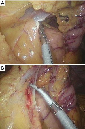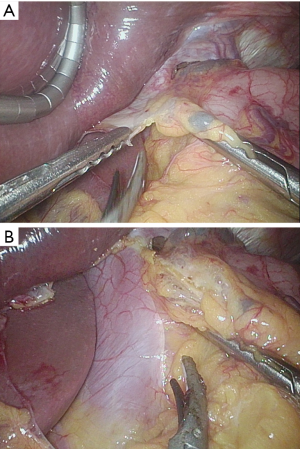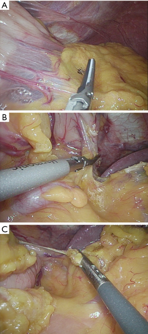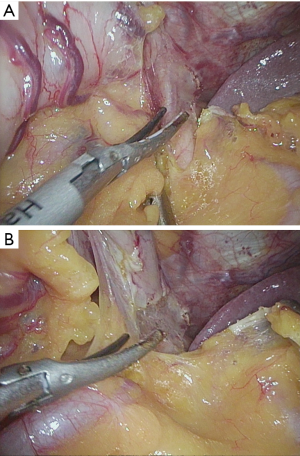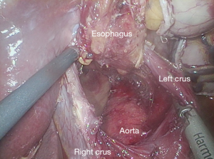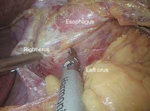 The gastrocolic, gastrosplenic and gastrohepatic ligaments are divided in this portion of the procedure. I use the ultrasonic shears energy device (Harmonic ACE with advanced hemostasis Ethicon/J&J US) for all dissection. I previously began by dividing the gastrocolic ligament, however, more recently, I have started by dividing the gastrohepatic ligament beginning at the pars flaccida and proceeding in a cephalad direction exposing the right crus (Figure 1A,B). I then divide the phrenoesophageal ligament beginning at the right crus and extending over to the left crus, exposing the left crus anteriorly (Figure 2).
