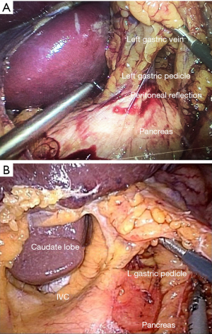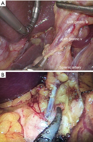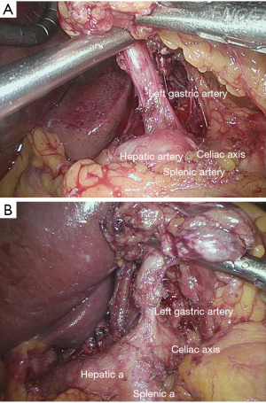 With the stomach otherwise fully mobilized, the left gastric pedicle is grasped near the lesser curvature and gentle cephalad traction applied. This puts the left gastric pedicle on some tension and helps to identify its origin (Figure 11). The peritoneum overlying the upper border of the pancreas is incised and then the plane of dissection deepened. The left gastric vein is divided at the base of the pedicle as it passes posteriorly and inferiorly to join the portal vein (Figure 12). The origin of the LGA and the trifurcation of the celiac artery into the LGA, common hepatic and splenic arteries is exposed (Figure 13A). It is important to see the origin of the 3 arteries as the LGA pedicle should be divided as close to its origin as possible. The LGA is skeletonized, sweeping the lymph node bearing fatty tissues up with the specimen. This dissection is facilitated by dividing the soft tissues between the origin of the LGA and the confluence of the right and left crura. The artery is taken either with an endovascular load of the endoGIA (Covidien) or if small, with clips. I previously completed the full lymph node dissection with the LGA intact (Figure 13B) and prior to creating the gastric conduit. I have found that division of the LGA and creation of the conduit allows better visualization for completion of the lymph node dissection.