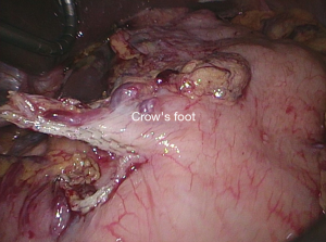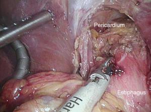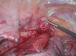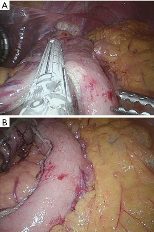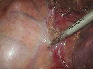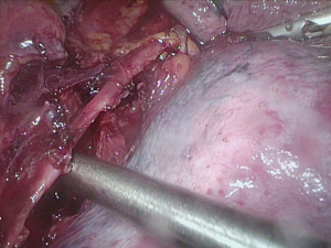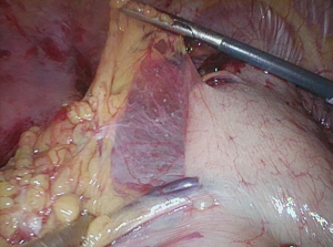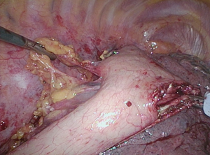 The division of the gastrohepatic ligament is completed, and then the lesser curvature tissues are divided to the gastric wall. Previously these tissues were divided at the level of the incisura, I now divide these tissues to the gastric wall just below the crow’s foot. This will be the site for initiation of the gastric staple line. This completes this portion of the operation.