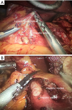 At this point in the procedure, the left gastric nodes have been resected and are left attached to the resected proximal stomach. Beginning at the level of the left gastric stump, the peritoneum overlying the common hepatic artery is divided and then the hepatic artery is skeletonized from its origin to its division into right and left branches. The lymph node bearing tissue is then dissected off the cephalad border of the hepatic artery by gently retracting the origin of the common hepatic artery inferiorly (Figure 16A,B). When doing this, one must be aware that the portal vein lies posterior to the artery and can be exposed by retraction of the artery. Once these nodes are fully dissected, they are removed from the abdomen, usually in a sterile specimen bag and submitted as a separate specimen for pathology.
