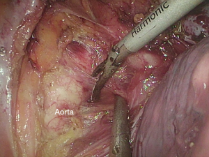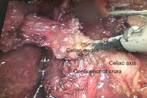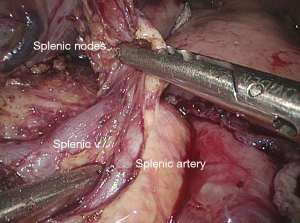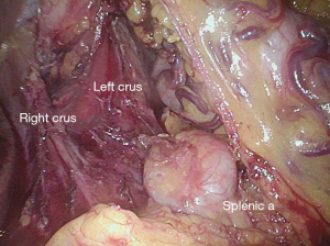 We next dissect the aortocaval nodes lying between the aorta/celiac axis and the inferior vena cava. This is accomplished using sharp dissection with the ultrasonic shears as well as blunt dissection with the suction device and/or peanut sponge. Many times there is very little tissue in this space and we do not do a formal dissection. The celiac nodes are dissected next, beginning at the level of the LGA stump and proceeding up to the confluence of the right and left crura (Figure 17). Lastly we skeletonize the splenic artery beginning at its origin and following it distally. We generally stop short of the splenic hilum but include the soft tissues overlying the retroperitoneum between the splenic artery and the left crus. Again, this is facilitated by gently retracting the pancreas inferiorly, being aware that the splenic vein lies just posterior to the artery (Figure 18). It is safest to follow the artery closely, staying right on the artery from proximal to distal, as the artery may be quite tortuous and injury can result if the surgeon deviates away from the artery (Figure 19). Once the lymphadenectomy is completed the hepatic, splenic, left gastric and celiac arteries are completely skeletonized.