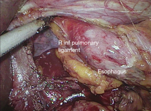 Following completion of the lymphadenectomy, we turn to the hiatal dissection. The hiatus is opened medial to the right crus. The confluence of the crura and left crus are exposed posteriorly (Figure 20). This is facilitated by retracting the resected proximal stomach to the patient’s left. I expose the descending thoracic aorta above the hiatus and skeletonize it, sweeping all the fatty tissue up with the esophagus (Figure 21). I then come around to the right and open into the right pleural space, again taking the fatty tissue superior and adjacent to the hiatus with the esophagus. I continue around anteriorly and skeletonize the posterior pericardium (Figure 22). I divide the right inferior pulmonary ligament close to the pulmonary parenchyma so that the lymph node bearing tissue in the ligament is included with our resected specimen (Figure 23). I retract the resected proximal stomach to the patient’s right and similarly resect the perihiatal fatty tissue, the left pleura and left pulmonary ligament proceeding from posterior to anterior until I join the plane of dissection on the posterior pericardium. The hiatal dissection is facilitated by retracting each crus laterally to aid visualization of the lower mediastinum. We continue the dissection as high as is comfortable. We do not attempt to completely divide the inferior pulmonary ligaments and are careful as we proceed superiorly to avoid injury to the inferior pulmonary veins.
