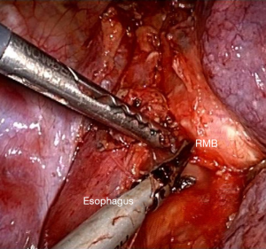 The pleura above and below the azygous vein arch is divided, the azygous vein skeletonized and then taken with the endo-GIA vascular load. The esophagus is gently retracted posteriorly and the pleura overlying the right main bronchus (RMB) is carefully opened beginning at the level of the divided azygous vein and proceeding inferiorly. The right vagus is divided as it crosses the RMB (Figure 24). Keeping posterior traction on the esophagus, the esophagus is mobilized off the posterior pericardium from the level of the RMB down to the level achieved by the hiatal dissection during the abdominal phase. During this dissection, we may leave the subcarinal node packet in situ or remove it with the esophagus depending on the ease of removal. As we proceed from the right RMB inferiorly, we skeletonize the right inferior pulmonary vein. The mobilization of the esophagus away from the pericardium is continued proceeding from the right toward the left until the left inferior pulmonary vein is identified and skeletonized. The esophagus is then mobilized off the distal trachea, tracheal carina and left main bronchus (Figure 25). Extreme care must be used to avoid thermal injury to the membranous airways. The LMB is particularly at risk because of distension by the bronchial balloon of the double lumen tube. Once the distal trachea and LMB are fully exposed, attention is directed to the dissection of the esophagus posteriorly.