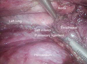 The esophagus is retracted anteriorly, and the pleura anteromedial to the ascending azygous vein is incised beginning at the level of the divided azygous arch and proceeding inferiorly down to the hiatus (Figure 26). The esophagus is the dissected off the descending aorta (Figure 27). The aorta is skeletonized from the aortic arch down to the hiatus exposing the left lung and left inferior pulmonary ligament (Figure 28). Most of the branches off the aorta can be managed with the ultrasonic shears, but it is prudent to leave a short stump of these branches on the aortic side to allow for placement of a clip or suture, if hemostasis with the ultrasonic shears is insufficient. Particularly troublesome are two small branches arising from the undersurface of the arch itself.