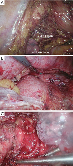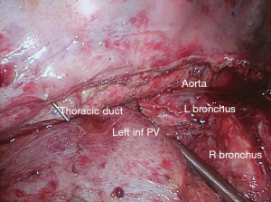 Once the descending aorta has been skeletonized, the division of the left pleura and the left inferior pulmonary ligament is completed proceeding from the lower chest superiorly (Figure 29A,B), skeletonizing the left inferior pulmonary vein and then dividing the left vagus nerve just above the left inferior pulmonary vein. The esophagus is then fully mobilized away from the aortic arch, LMB and distal trachea (Figure 29C). At this level, dissection is kept close to the esophagus to avoid injury to the left recurrent nerve. Once the infracarinal dissection is completed, the RMB, left main bronchus, carina, right and left inferior pulmonary veins, descending aorta and posterior pericardium have been skeletonized (Figure 30).
