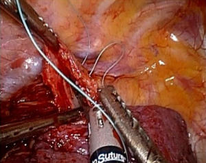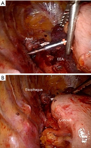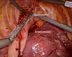 It can be difficult to advance the stapler between the ribs. Generally we use a 25 mm stapler and have found this to provide a satisfactory lumen without stricture or dysphagia. If the esophagus is very large, a 28 mm anvil may be required but it is even more difficult to pass the stapler between the ribs. Some surgeons introduce the stapler through an inferior port site where the interspaces are wider. The stapler can then be introduced into the stomach through a lesser curve gastrotomy as described or through the uppermost end of the conduit, pulling the conduit onto the stapler like a sock. My own experience with these methods is limited. When using these methods I have experienced some difficulty in placing the anastomosis exactly in the desired location on the great curve tending to always be higher than intended, but perhaps this would be overcome with more experience.