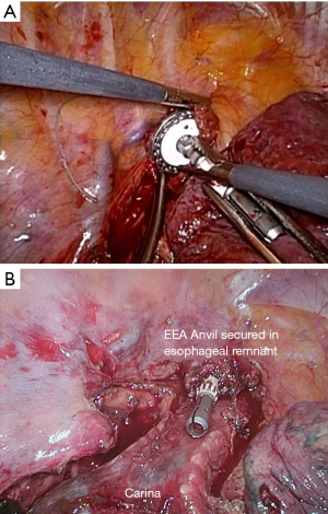 An alternative anastomotic technique uses the ORVIL device (Covidien). The Orvil device passed per os into the esophageal remnant. It can be challenging to get it to pass the upper sphincter and we have often scrubbed out to assist our anaesthesiologist with this step using a laryngoscope. A small esophagotomy is made adjacent to the stapled end of the esophageal remnant and the delivery device is advanced through the esophagotomy into the chest until the circular portion of the anvil is seated at the esophageal staple line with the post fully positioned beyond the esophagotomy. The EEA stapler is then docked on the anvil, turned down and fired. Problems have arisen with leaks, largely related to the crossing staple lines. This has led some surgeons to move the esophagotomy from the middle of the esophageal staple line to one corner or to a site positioned 1 cm away from the esophageal staple line. We have moved away from the Orvil because of our high leak rate when using the device. Surgeons who continue to use it, anecdotally report reinforcing the anastomosis with sutures, particularly where staple lines cross.