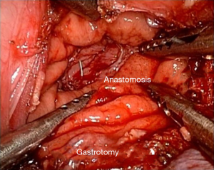 Following completion of the anastomosis, the anastomosis is submerged under warm saline and an endoscopy is performed insufflating air into the esophageal reconstruction. The absence of bubbles in the saline is reassuring that there is no technical leak. We have found this quite useful not only for the anastomosis but also for the occasional injury to the conduit, or leak at the gastric staple line. The gastroscope is advanced through the pylorus and then withdrawn verifying the correct orientation of the conduit. We find that passing the scope through the pylorus serves to dilate it somewhat.