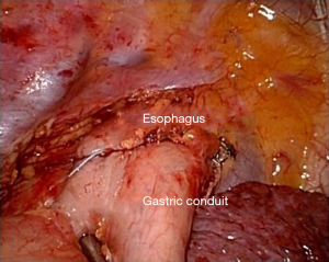 Once the hiatal dissection is complete, we suture the tip of the conduit to the lower portion of the resected proximal stomach using two sutures to maintain orientation. The liver retractor is then removed, followed by all ports, the CO2 is evacuated from the abdomen and the port sites are closed in standard fashion. We then insert a chest tube into the left pleural space through a small incision in the left inframammary fold in the anterior axillary line. We have recently moved from 28 to 20 Fr chest tubes.