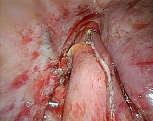 Once the specimen is removed, we dissect out the subcarinal lymph node packet if these have been left in situ, skeletonizing the main bronchi, carina and posterior pericardium if this has not been done previously. If the upper mediastinal node dissection is performed, it is at this point in the procedure that this is undertaken. We use bipolar energy and blunt dissection for this lymphadenectomy, taking the paratracheal tissue off the lateral walls of the trachea up to the right innominate artery and the common carotid on the left. This has not been a routine part of our procedure as most of our patients have cancers of the distal esophagus and gastroesophageal junction. However, we have had late isolated recurrences in this region and are starting to incorporate the paratracheal dissection as a routine part of the operation.