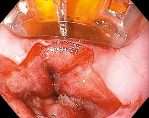 Gastric and esophageal perforations can be managed endoscopically (non-surgically) if recognized early, the defect is small and the patient is hemodynamically stable. Through-the-scope (TTS) clips can be considered for defects <1 cm, and over-the-scope clips (OTSC) can be considered for defects up to 3 cm. Endoscopic suturing and esophageal stents have also been used successfully as well (8,41). Delayed presentation/recognition of perforation, large perforations, and/or hemodynamic instability requires broad-spectrum antibiotics, intravenous proton pump inhibitor, fluid resuscitation, radiographic evaluation and multidisciplinary discussion. Teamwork and quick medical decision making are critical in these events. A multidisciplinary approach is often helpful in achieving the best outcomes.