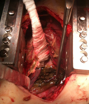 Injuries of upper and medium esophagus are usually approached by right thoracotomy (V intercostal space), while distal esophageal perforations are better managed through left thoracotomy (VI intercostal space). In the last years, the role of thoracoscopy for managing esophageal perforation has been improving, allowing a faster recovery of the patients (1,19). Surgical treatment consists of debridement of necrotic tissue and toilette of purulent material (Figure 1) to expose the perforation. In early treatment, the attempt of suture can be successful and requires a proximal and distal myotomy to expose the mucosal rupture, that must be repaired by interrupted absorbable suture. Then the esophageal muscle must be closed with another interrupted suture, better if buttressed with vascularized flap of intercostal muscle, diaphragmatic pedicle, pleural or omental graft (1,6). When a repair is not feasible, like in delayed context or in the setting of extensive necrotic tissue, a hybrid treatment can be attempted: after surgical toilette and drainage of mediastinum and pleural space, a stent or a nasoesophageal tube can be placed to avoid directly an esophageal resection or diversion. Several exclusion and diversion techniques are described (5). Conventionally, a proximal and distal diversion is performed to exclude the perforated tract and an end or side cervical esophagostomy is made. This technique requires a second stage of reconstruction. To eliminate the need of a second operation, a proximal esophageal ligation can be done with creation of a cervical esophageal mucosa fistula (side esophagostomy) (1).