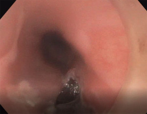 The gastroscope is aligned to make sure the 12-o-clock and 6-o-clock positions are identified, and the scope is oriented in the lumen of esophagus. The clear plastic cap is installed on the tip of the scope, and the holes are oriented such that they are placed next to the suction channel.