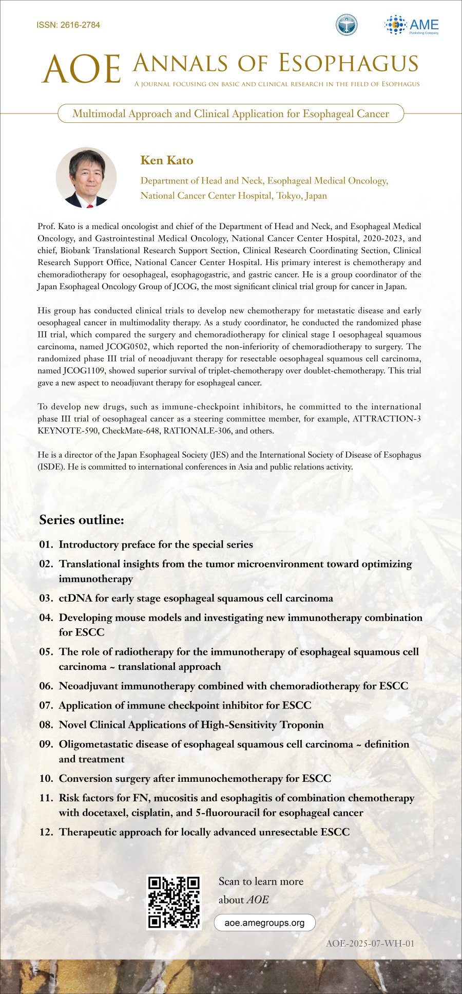 Prof. Kato is a medical oncologist and chief of the Department of Head and Neck, and Esophageal Medical Oncology, and Gastrointestinal Medical Oncology, National Cancer Center Hospital, 2020-2023, and chief, Biobank Translational Research Support Section, Clinical Research Coordinating Section, Clinical Research Support Office, National Cancer Center Hospital. His primary interest is chemotherapy and chemoradiotherapy for oesophageal, esophagogastric, and gastric cancer. He is a group coordinator of the Japan Esophageal Oncology Group of JCOG, the most significant clinical trial group for cancer in Japan.